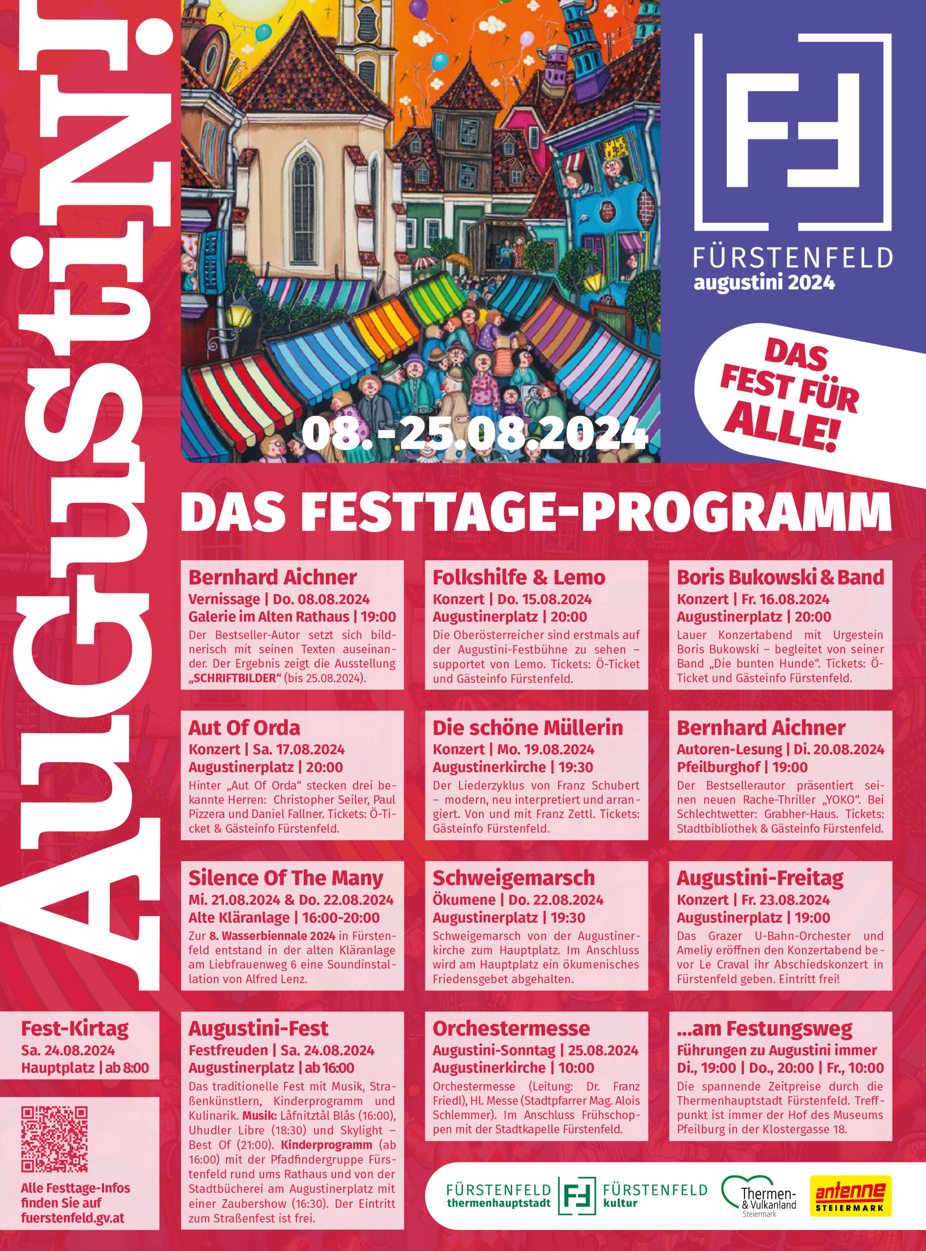 Das große Augustini-Fest findet am Samstag, 30. August ab 16 Uhr statt – mit einem vielfältigen Programm bei freiem Eintritt! Schon von 10 bis 12 Uhr tourt die Fürstenfelder Stadtkapelle durch die Innenstadt. Den Auftakt zu Festbeginn machen dann um 16 Uhr die Låfnitztåler Blås, gefolgt von St3 (18 Uhr) und ZWIRN (20:30 Uhr), einer der besten österreichischen Stimmungsbands. Für Kinder gibt es um 16 Uhr den Colombinas Mitmach-Zirkus in der Stadtbücherei und ein Erlebnisprogramm der Pfadfinder im Bereich des Wallgrabens ab 17 Uhr. Das Museum Pfeilburg lädt seine Besucher:innen von 14 bis 17 Uhr bei freiem Eintritt zu einer Reise durch die Fürstenfelder Stadtgeschichte. Kulinarik und das beliebte Weindorf sorgen für genussvolle Begleitung am Augustinerplatz.